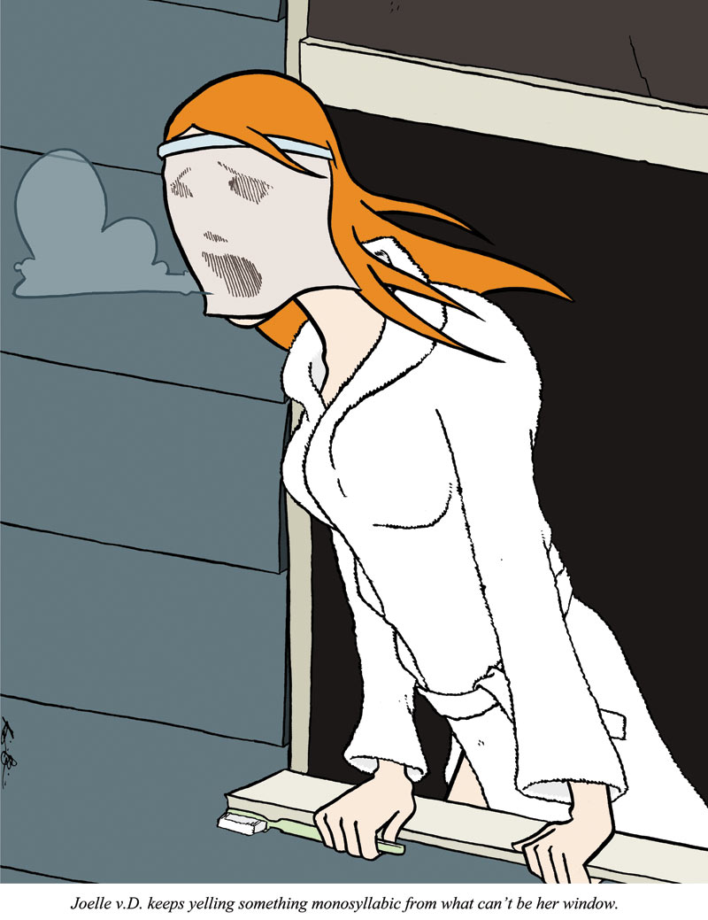 Hal, Pemulis et al have come out of the meeting with Tavis apparently unscathed. We learn that Hal is going clean (p. 635) and the excessive saliva may be the first sign of pot-withdrawl. Ortho’s near-win against Hal has him thinking he may be able to will objects to move, which may explain his bed moving, as the ball on the court curved “like a drenched spitter” in play. Also, objects are appearing in odd places, even suspended from walls with no apparent means of attachment.